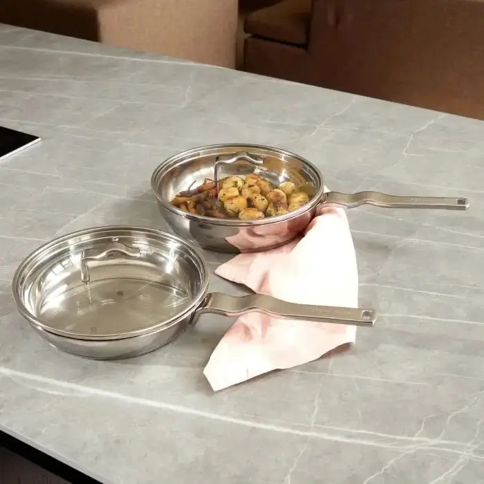 A premium 24cm Frying Pan and Glass Lid Set ideal for frying, searing or browning foods. The Flow Cookware Range is created from mirror polished stainless-steel with a unique handle designed by Carrol.